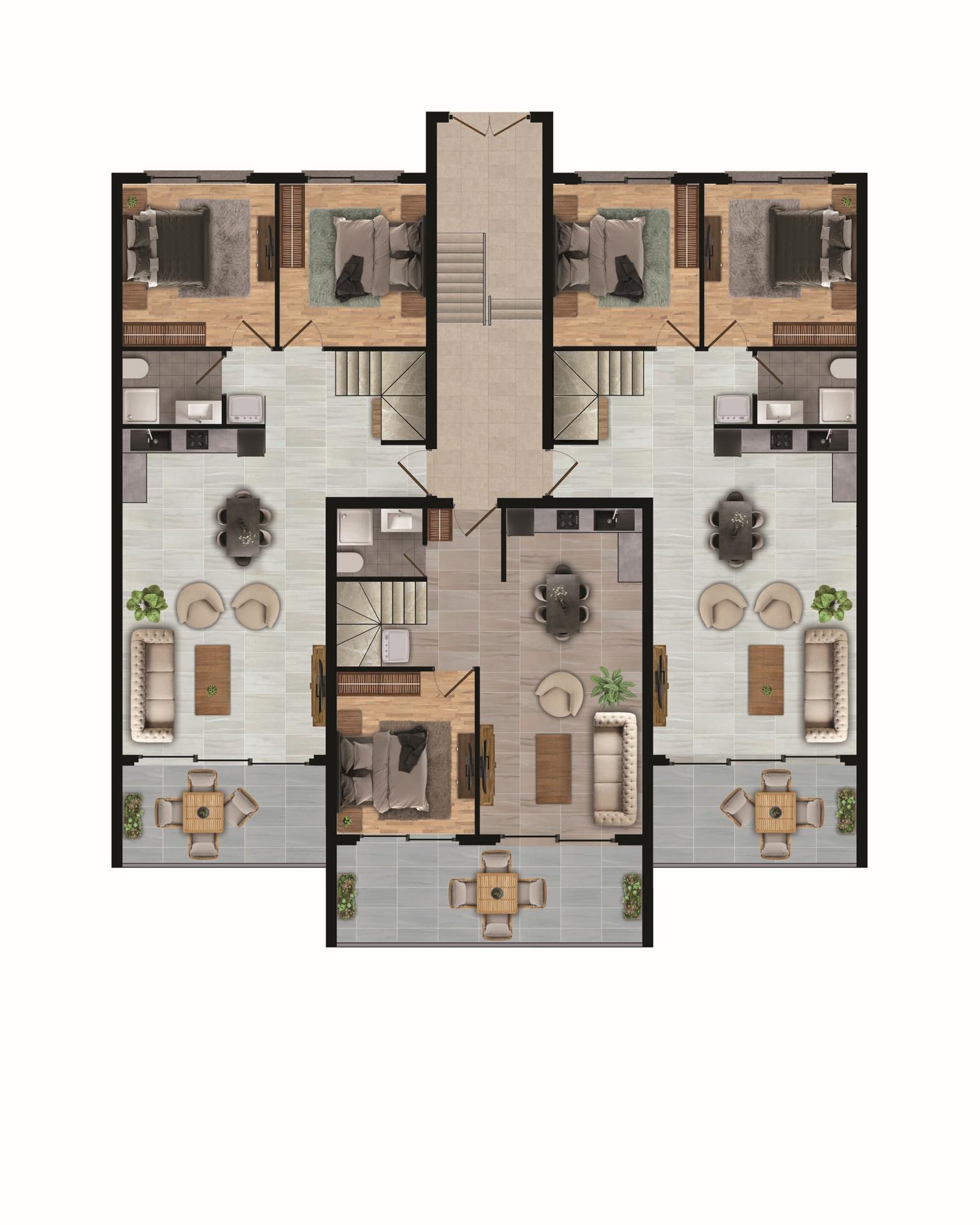 To mieszkanie duplex 3+1 oferuje przestronny, dwupoziomowy układ zaprojektowany z myślą o wygodnym życiu rodzinnym. Nieruchomość zazwyczaj obejmuje trzy sypialnie, obszerny salon z jadalnią w układzie otwartym oraz prywatne tarasy, z których mieszkańcy mogą podziwiać panoramę morza i gór. Rozwiązanie w formie duplex zapewnia naturalny podział na strefę dzienną i nocną, gwarantując prywatność oraz funkcjonalność odpowiadającą współczesnym stylom życia.