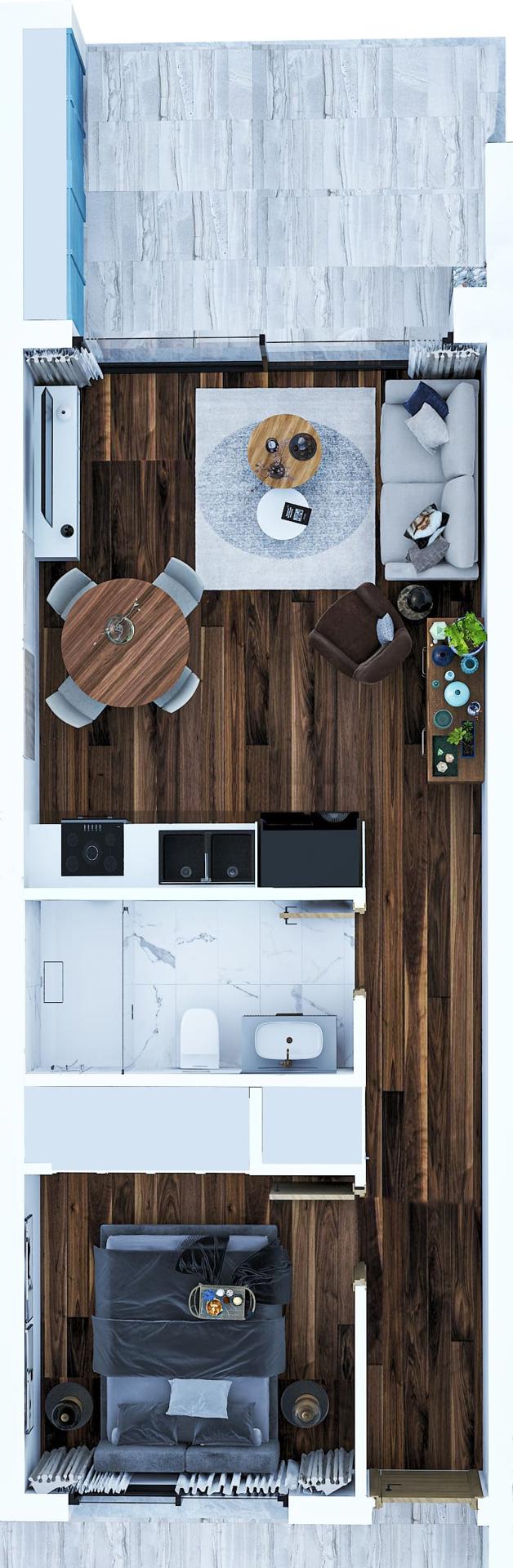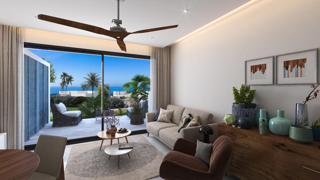 Bu 1+1 zemin kat daire, konforlu sahil yaşamı için tasarlanmış pratik ve modern bir plana sahiptir. İç mekânda genellikle geniş bir yatak odası, açık plan oturma ve mutfak alanı ile özel terasa veya bahçe alanına doğrudan erişim bulunur. Geniş pencereler, dairenin tamamına doğal ışık dolmasını sağlayarak aydınlık ve davetkâr bir atmosfer yaratır ve iç mekânları çevredeki peyzajla bütünleştirir.